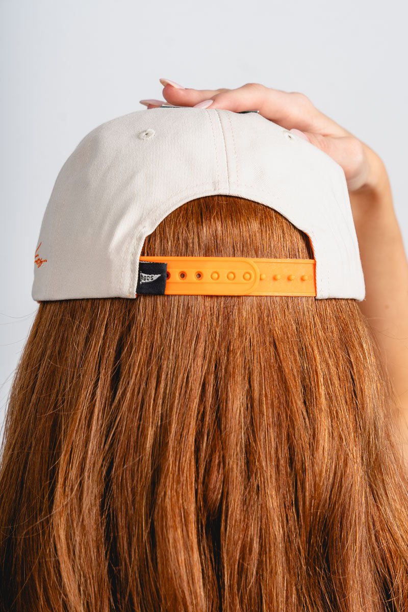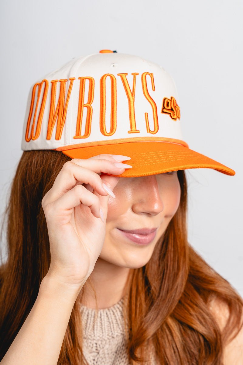 Ivory baseball hat with an orange bill featuring "COWBOYS" in an orange stitched block font and an OSU logo from Lush Fashion Lounge women's boutique in Oklahoma City.