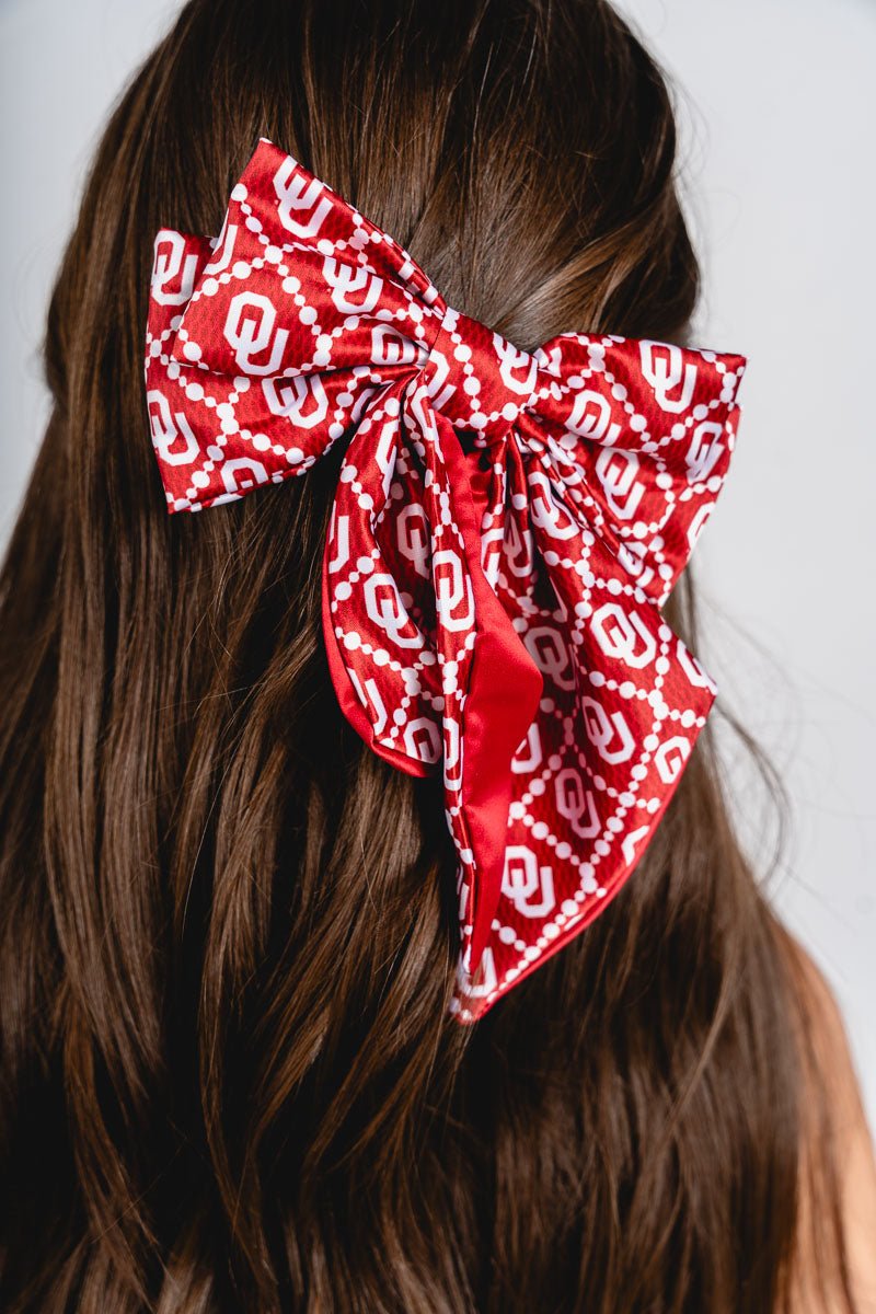 Red satin hair bow with a white diamond print featuring a white "OU" logo in the diamond print attached with a barrette from Lush Fashion Lounge women's boutique in Oklahoma City.