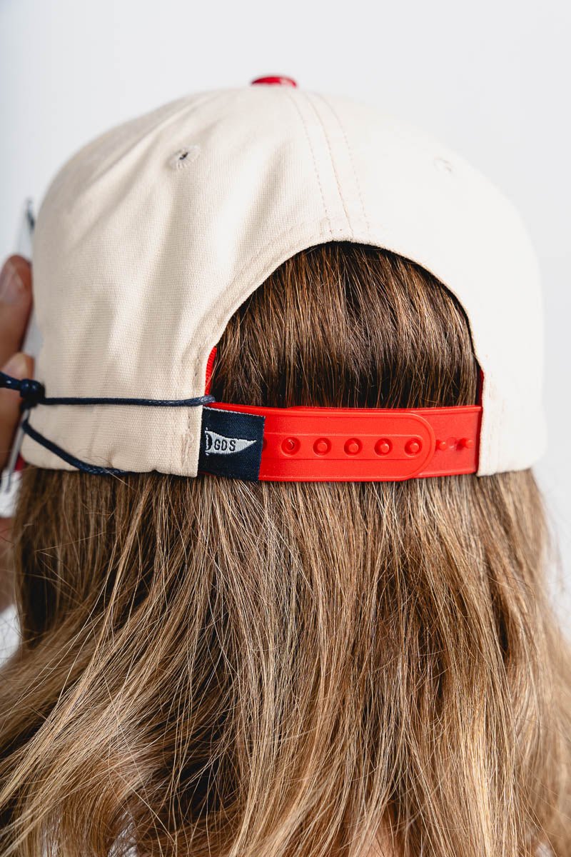 Ivory baseball hat with a crimson bill featuring "OKLAHOMA" in a red stitched block font and an OU logo from Lush Fashion Lounge women's boutique in Oklahoma City.