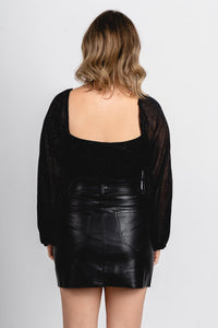 Long sleeve ruched square neck bodysuit featuring glitter throughout from Lush Fashion Lounge women's boutique in Oklahoma City.