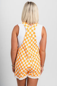 Orange and white checkered shorts overalls with a chest pocket, belt loops, hip pockets, and cuffed shorts from Lush Fashion Lounge women's boutique in Oklahoma City.