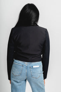 Black cropped blazer that button at the waist from Lush Fashion Lounge women's boutique in Oklahoma City.