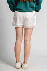 Elastic waist satin shorts with lace trim along the leg hem line from Lush Fashion Lounge women's boutique in Oklahoma City.