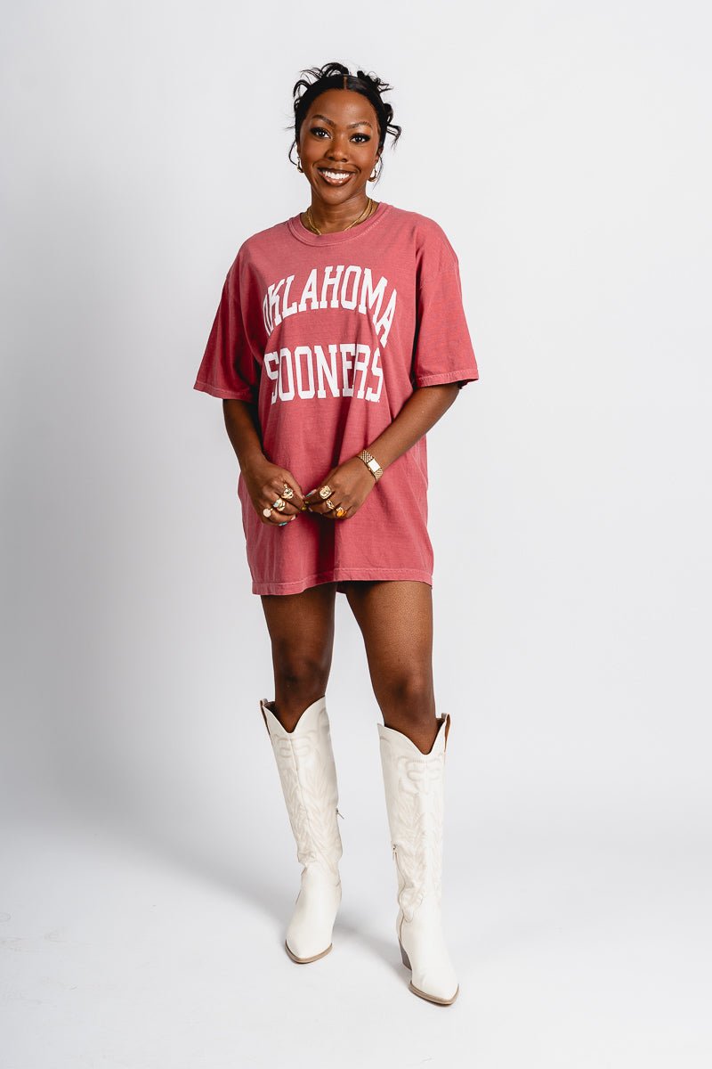 Crimson oversized t-shirt with a large white "Oklahoma Sooners" in a collegiate block front across the chest from Lush Fashion Lounge women's boutique in Oklahoma City.