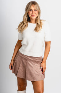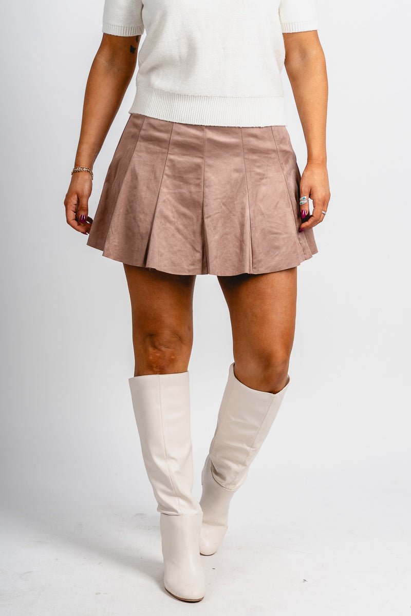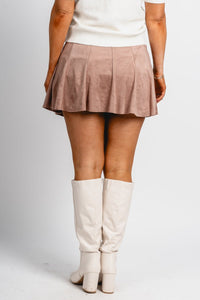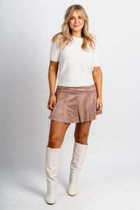 Suede high rise skort with a flare skirt layered over built in shorts from Lush Fashion Lounge women's boutique in Oklahoma City.
