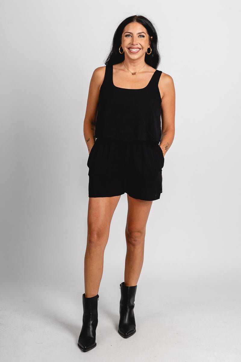 Black sleeveless romper that cinches at the waist with a flowy overlay top and flowy shorts with pockets from Lush Fashion Lounge women's boutique in Oklahoma City.