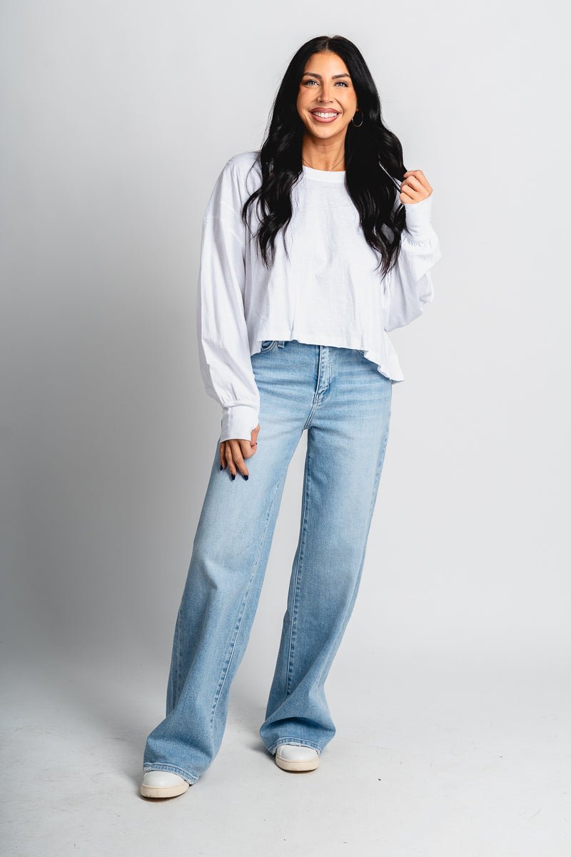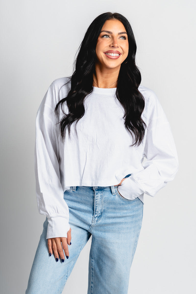 Long sleeve boxy t-shirt top featuring an open back from Lush Fashion Lounge women's boutique in Oklahoma City.