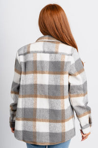 Flannel shacket featuring a grey, ivory, and khaki plaid checked pattern from Lush Fashion Lounge women's boutique in Oklahoma City.