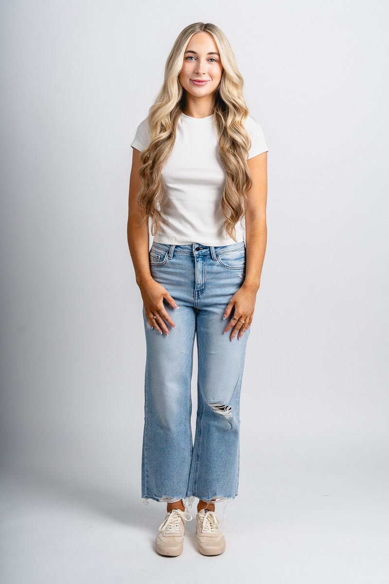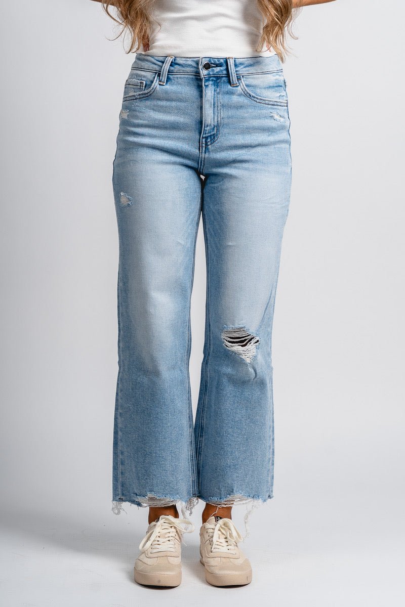 Light wash high rise slim fit wide leg jeans featuring distressing on one knee and a distressed raw hem on each pant leg from Lush Fashion Lounge women's boutique in Oklahoma City.