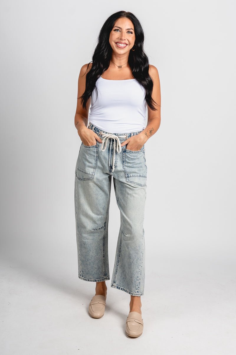 Vintage washed curved leg high waisted jeans with a drawstring and large front pockets from Lush Fashion Lounge women's boutique in Oklahoma City.