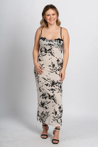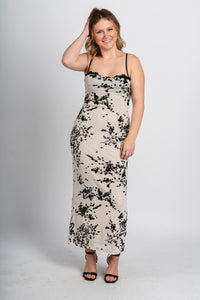 Spaghetti strap ivory mesh midi dress featuring a black floral velvet pattern, a lace cowl neck, and a black clasp on the back from Lush Fashion Lounge women's boutique in Oklahoma City.