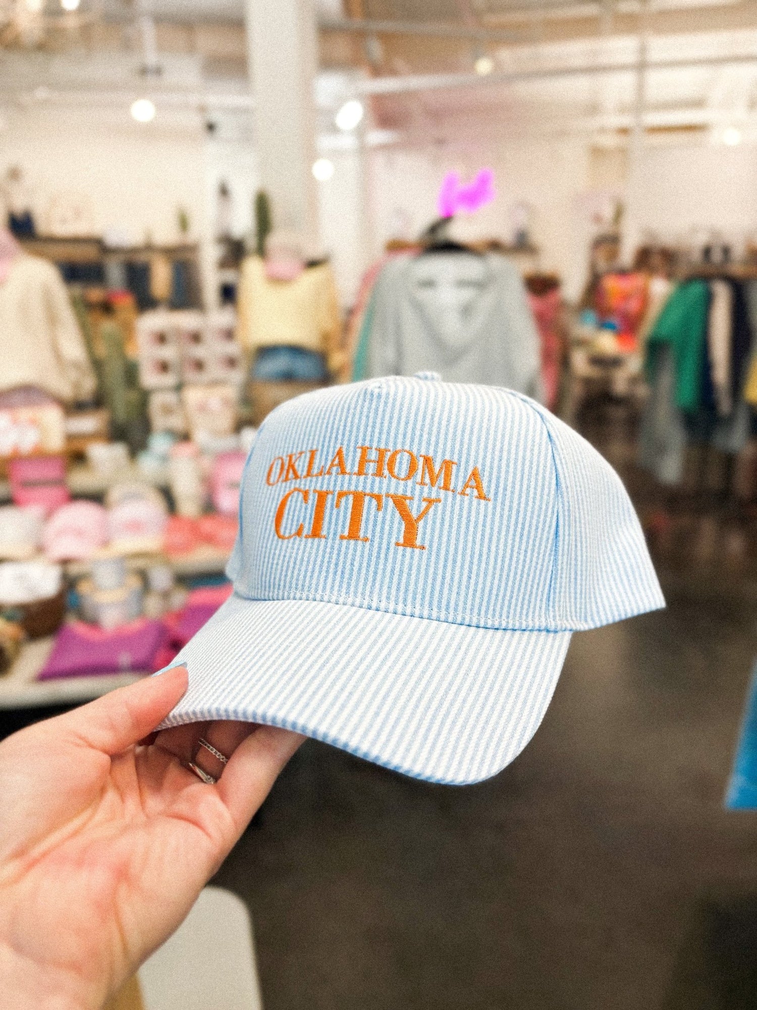 Light blue and white pinstripe hat featuring "Oklahoma City" stitched in orange on the crown from Lush Fashion Lounge women's boutique in Oklahoma City.