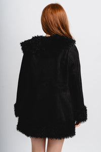 Suede blazer jacket featuring a fur trim along the bottom. sleeves, and neck line from Lush Fashion Lounge women's boutique in Oklahoma City.