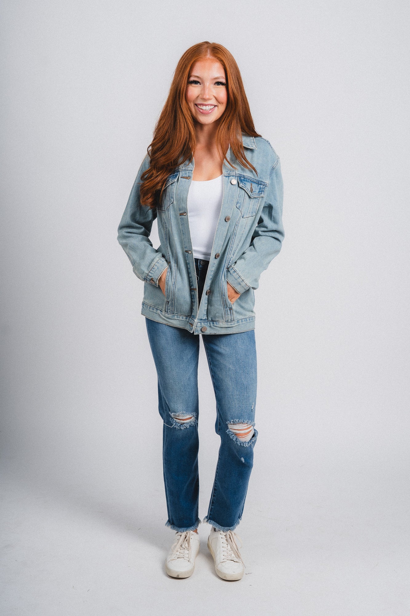 Light blue denim jacket with the "OKLA" printed in crimson on the back of the jacket from Lush Fashion Lounge women's boutique in Oklahoma City.