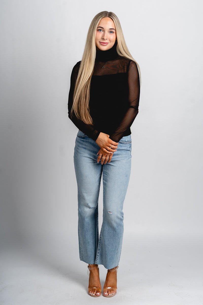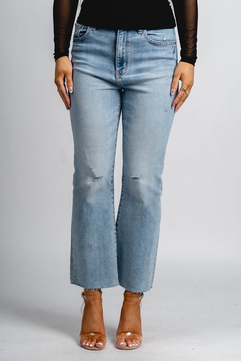 Light wash high rise jeans that crop around the ankle featuring a small flared leg from Lush Fashion Lounge women's boutique in Oklahoma City.