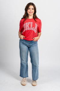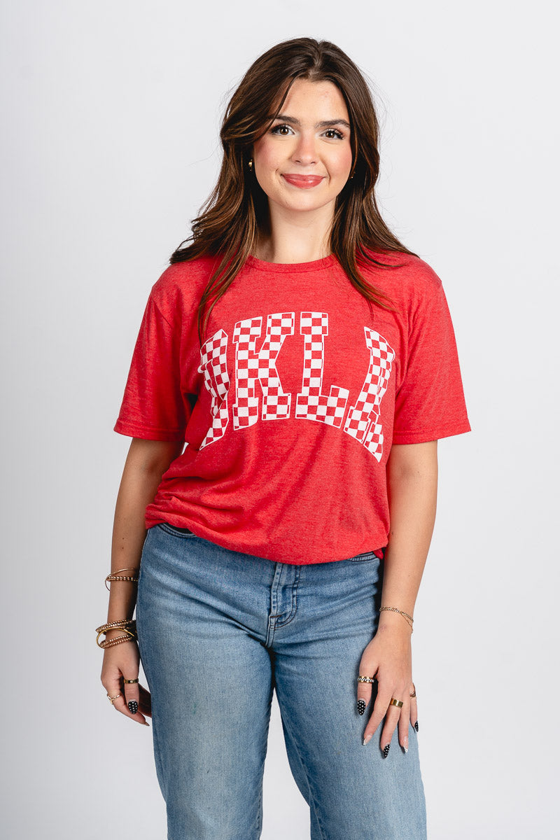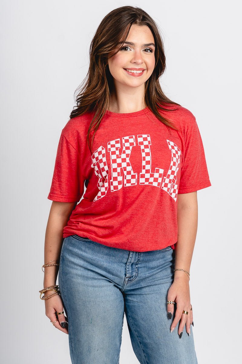 OKLA checkered unisex short sleeve t-shirt red from Lush Fashion Lounge boutique in Oklahoma City.