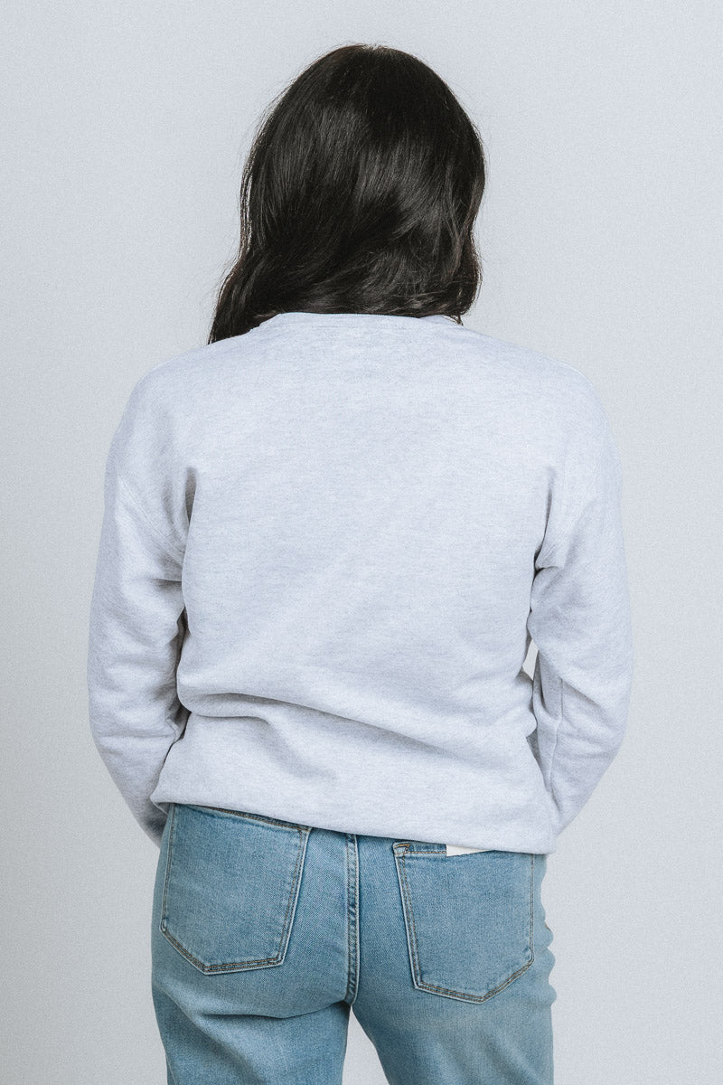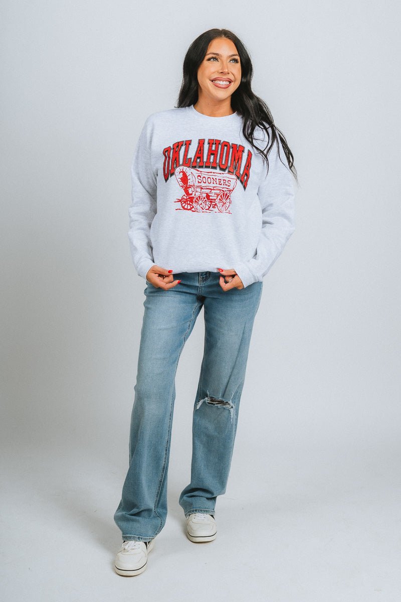 Heathered ash grey unisex sweatshirt featuring "Oklahoma" in a red collegiate block font and a red schooner underneath from Lush Fashion Lounge women's boutique in Oklahoma City.
