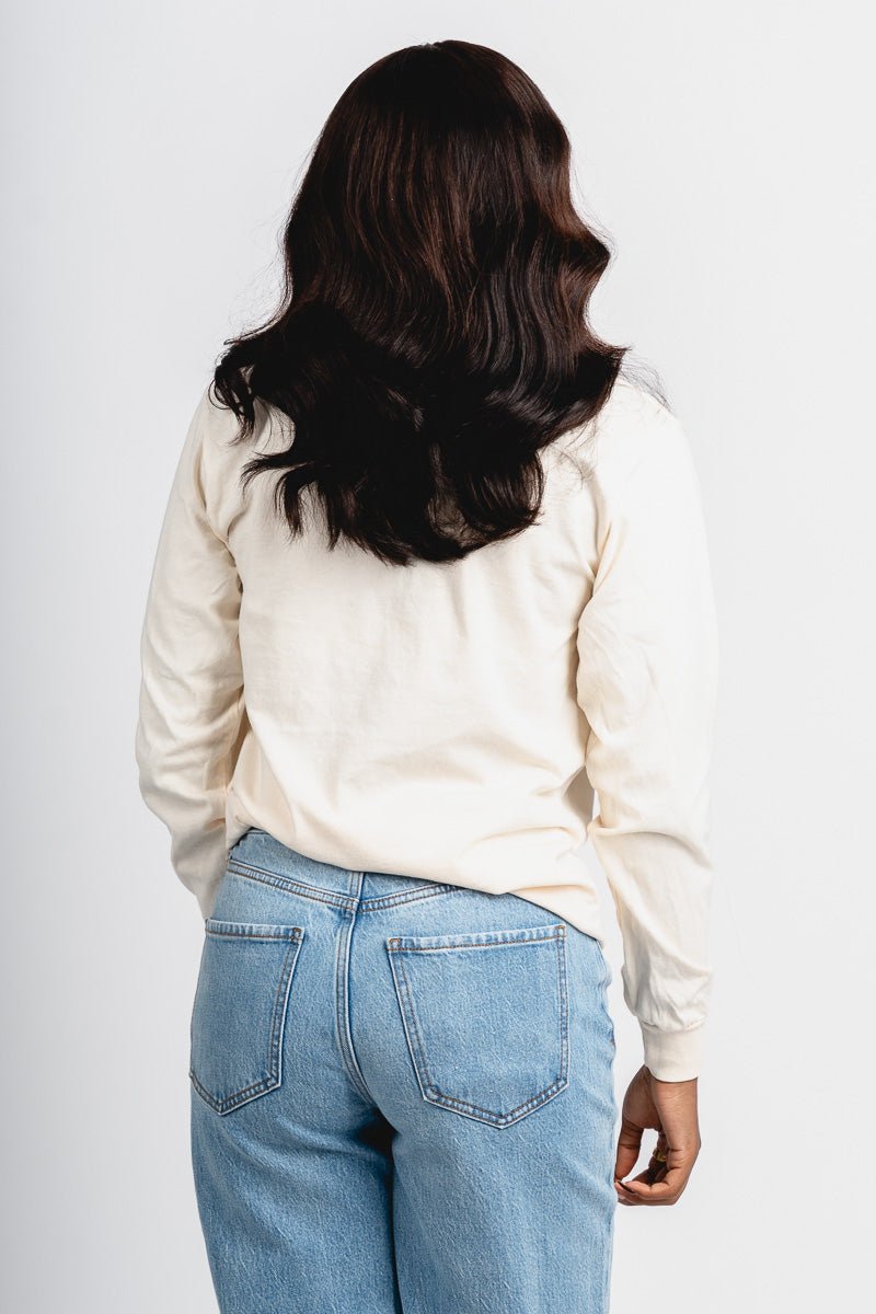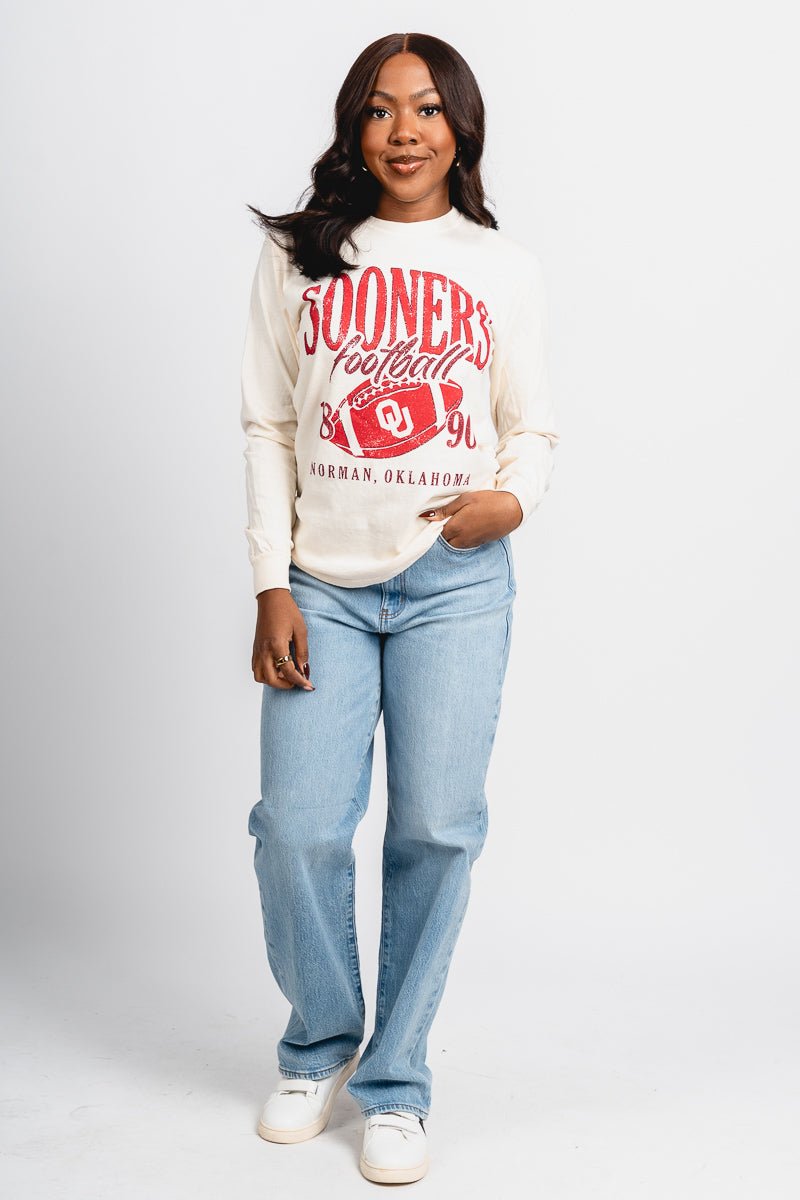 Cream long sleeve t-shirt featuring "Sooners football" in a crimson vintage font with a crimson OU football with "1890" split on either side of the ball and "Norman, Oklahoma" underneath from Lush Fashion Lounge women's boutique in Oklahoma City.