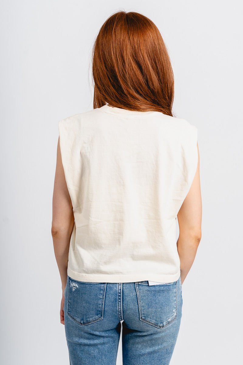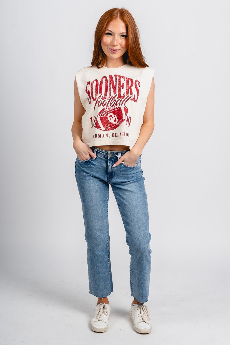 Cream boxy muscle tank top featuring "Sooners football" in a crimson vintage font with a crimson OU football with "1890" split on either side of the ball and "Norman, Oklahoma" underneath from Lush Fashion Lounge women's boutique in Oklahoma City.