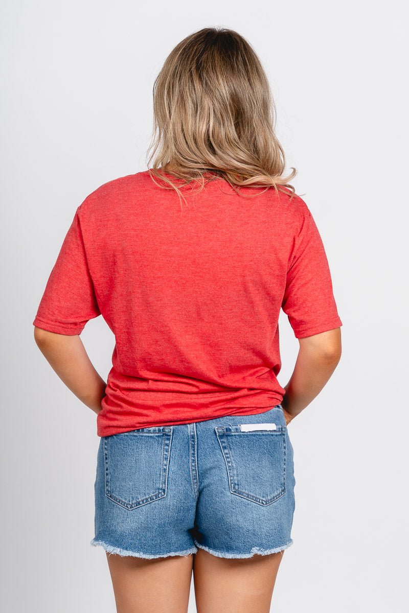 Red short sleeve unisex t-shirt featuring a white circle design with "Oklahoma" around the inside edges, "Sooners" script across the middle, and a schooner in the bottom left corner from Lush Fashion Lounge women's boutique in Oklahoma City.