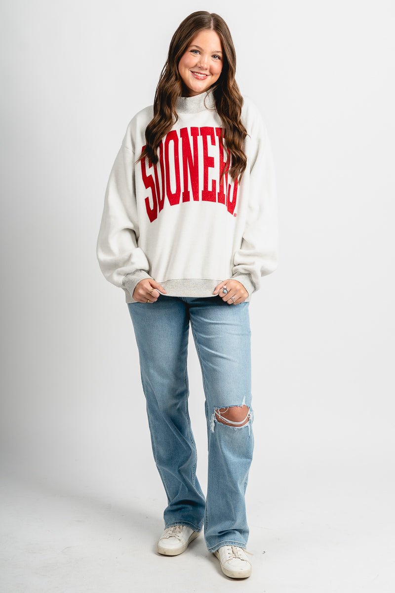 Grey mock neck sweatshirt that is designed to look inside out featuring "SOONERS" in a large red block font across the chest from Lush Fashion Lounge women's boutique in Oklahoma City.