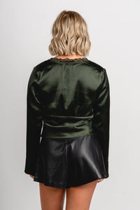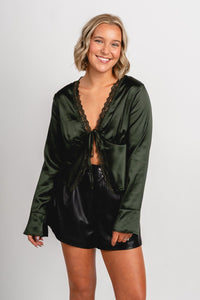 Long sleeve satin top featuring lace trim and a tie front closure at the chest from Lush Fashion Lounge women's boutique in Oklahoma City.