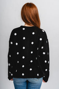 Black button up sweater cardigan featuring white polka dots from Lush Fashion Lounge women's boutique in Oklahoma City.