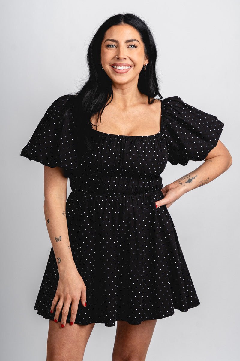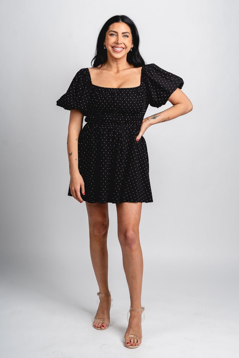 Puff sleeve mini dress featuring a cinched waist line and small white polka dots throughout from Lush Fashion Lounge women's boutique in Oklahoma City.