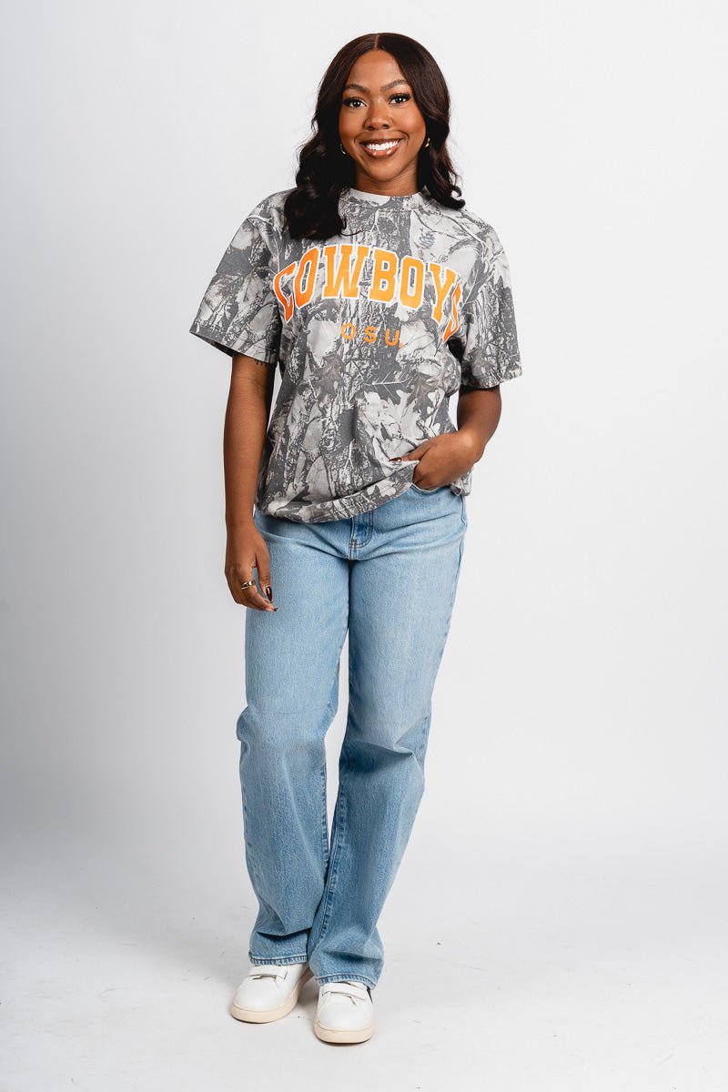 Black and white earthy camouflaged t-shirt featuring "Cowboys" in an orange block font across the chest with "OSU" below from Lush Fashion Lounge women's boutique in Oklahoma City.