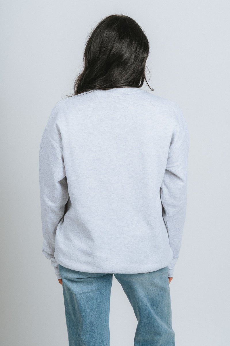 Heathered ash grey unisex sweatshirt with "Cowboys" in a white collegiate block font and Pistol Pete underneath from Lush Fashion Lounge women's boutique in Oklahoma City.