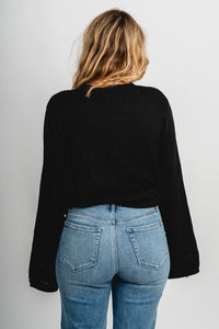 Crew neck long sleeve sweater featuring laser cuts along the wrists and hem line from Lush Fashion Lounge women's boutique in Oklahoma City.