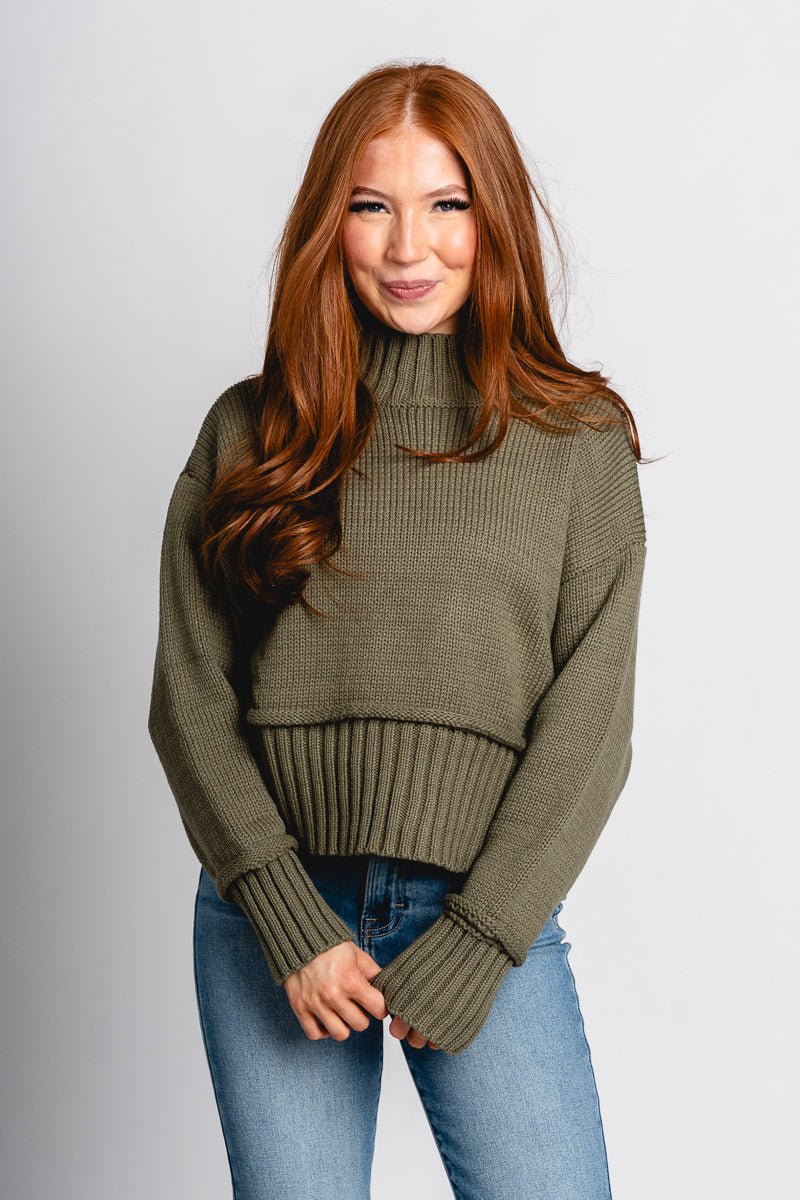 Mock neck knit sweater featuring a thick ribbed trim along the sleeves and bottom of sweater from Lush Fashion Lounge women's boutique in Oklahoma City.