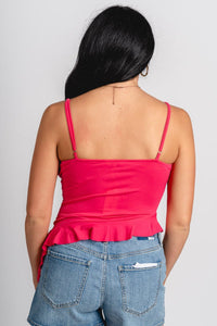 Pink spaghetti strap tank top with a ruffle trim along the neck line and an asymmetrical ruffle trim along the bottom from Lush Fashion Lounge women's boutique in Oklahoma City.