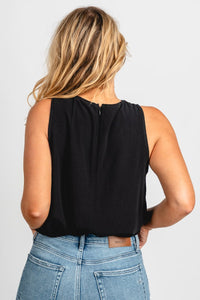 Chiffon cowl neck tank top featuring a gold decorative applique on the left shoulder from Lush Fashion Lounge women's boutique in Oklahoma City.