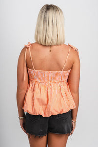 Orange and white gingham plaid babydoll top with a bubble hem and straps that tie at the shoulder from Lush Fashion Lounge women's boutique in Oklahoma City.