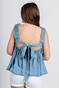 Light blue sleeveless tank top with gathered elastic straps and an elastic neckline with a loose and flowy body featuring a tie in the back from Lush Fashion Lounge women's boutique in Oklahoma City.