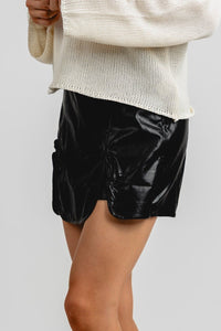 Faux leather skort featuring a leather bow at the mid thigh on each side from Lush Fashion Lounge women's boutique in Oklahoma City.