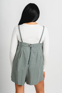 Sleeveless boxy knit romper featuring a cream and hunter green gingham plaid print from Lush Fashion Lounge women's boutique in Oklahoma City.