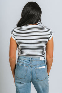 White colored bodysuit with black horizontal stripes. This striped bodysuit features a ribbed material, cap sleeves, thong bottom, and a snap closure from Lush Fashion Lounge women's boutique in Oklahoma City.