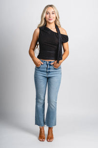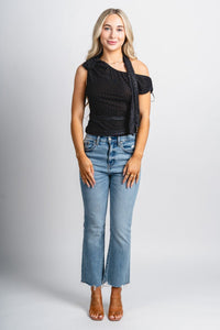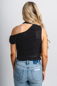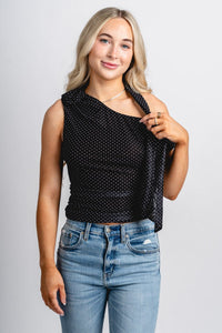 Sleeveless asymmetrical black top featuring small white polka dots throughout and ruching down each side from Lush Fashion Lounge women's boutique in Oklahoma City.