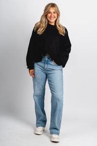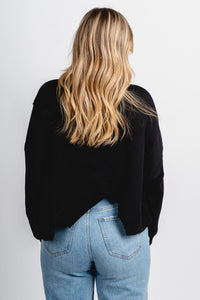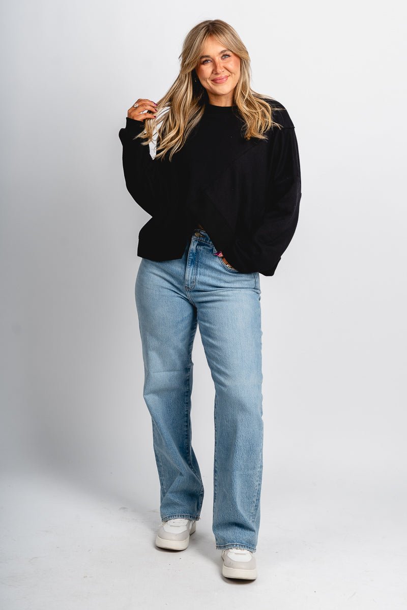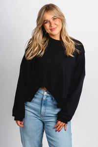 Oversized asymmetrical sweatshirt featuring a jagged edge hem line from Lush Fashion Lounge women's boutique in Oklahoma City.