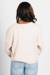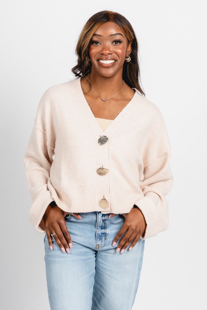 Cream button down sweater cardigan featuring 3 large gold buttons from Lush Fashion Lounge women's boutique in Oklahoma City.