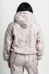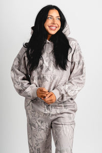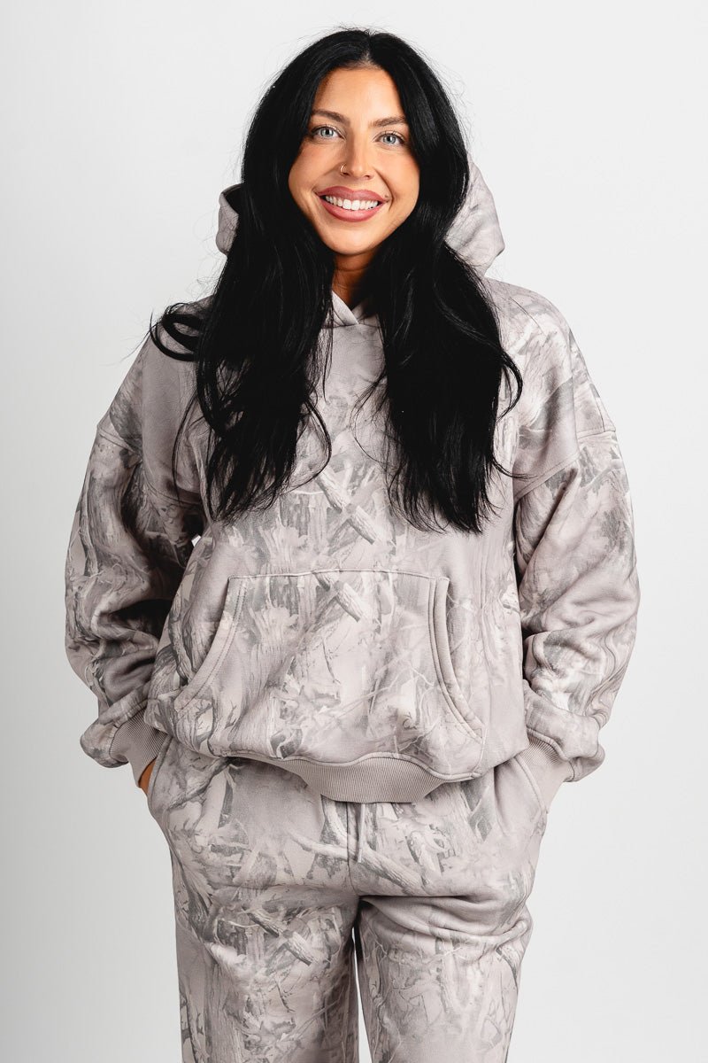 Light grey woodsy camouflage hoodie sweatshirt from Lush Fashion Lounge women's boutique in Oklahoma City.