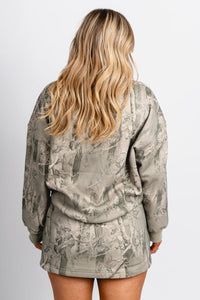Sage green crew neck sweatshirt featuring an earthy camoflauge print from Lush Fashion Lounge women's boutique in Oklahoma City.