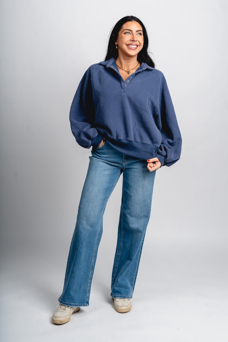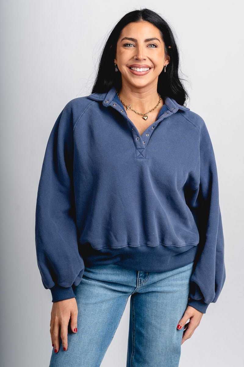 Oversized collared sweatshirt featuring a button snap closure at the chest from Lush Fashion Lounge women's boutique in Oklahoma City.
