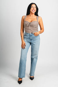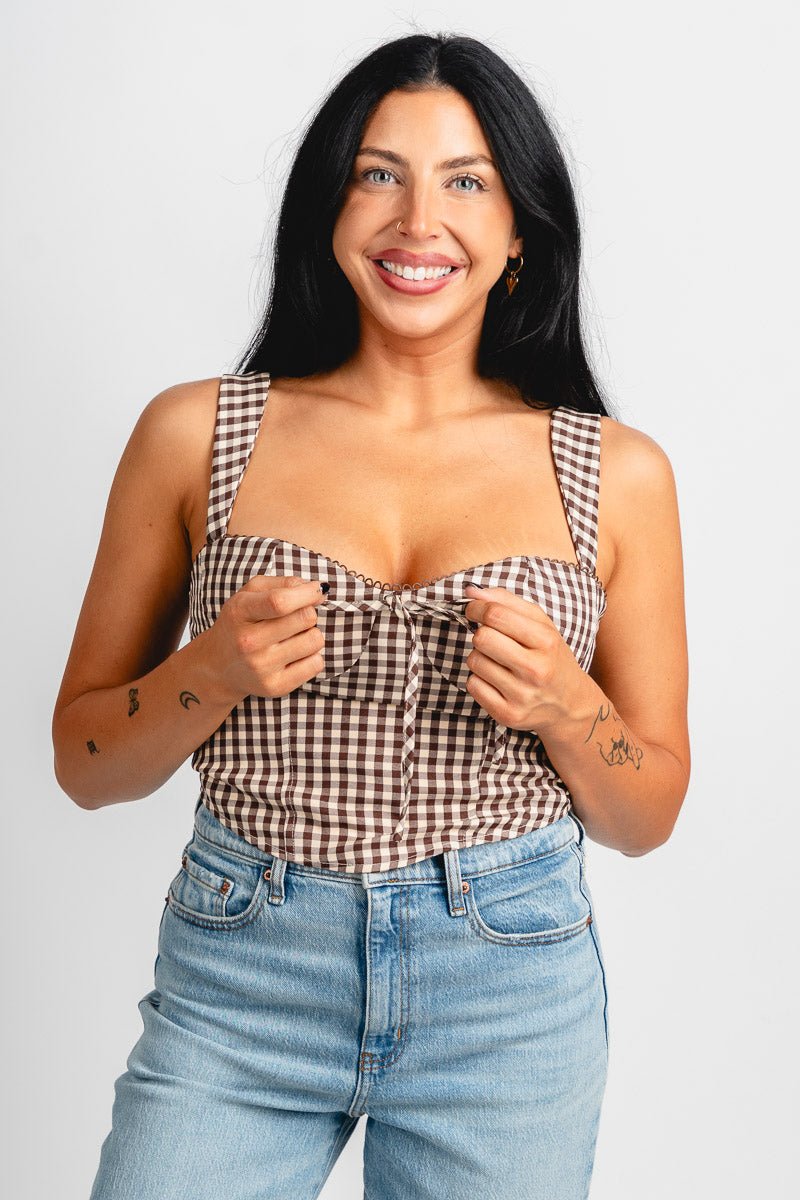 Cream and brown gingham check bustier top featuring a tie at the chest and adjustable spaghetti straps from Lush Fashion Lounge women's boutique in Oklahoma City.