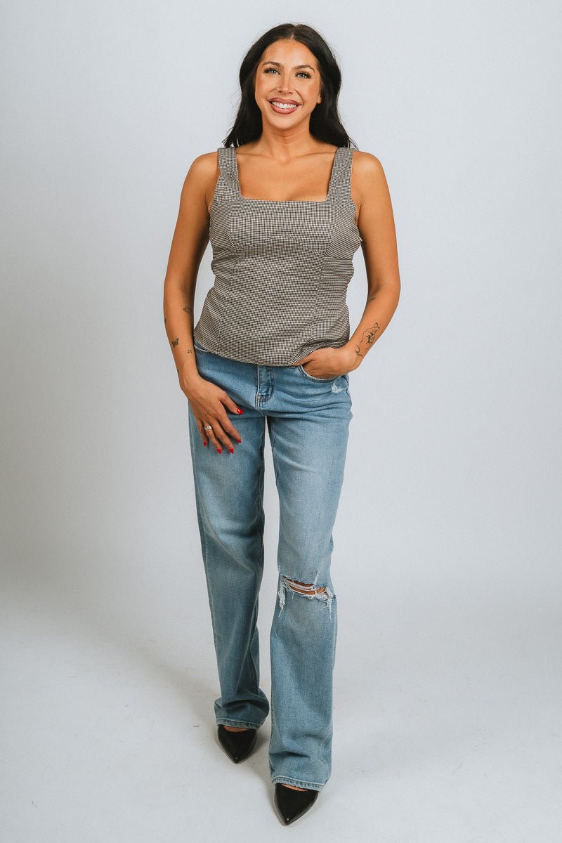 Lush boutique in OKC has a variety of cute tops for Fall! This trendy hounds tooth tank top is a must have! Perfect for any occasion! This top zips down the left side.