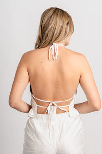 White lace eyelet halter top featuring smocking details and an open back that ties together with two ties at the neck and bottom of waist from Lush Fashion Lounge women's boutique in Oklahoma City.