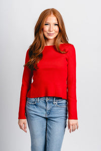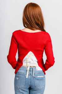 Red ribbed long sleeve sweater top featuring an open back that ties together with two cream bows from Lush Fashion Lounge women's boutique in Oklahoma City.
