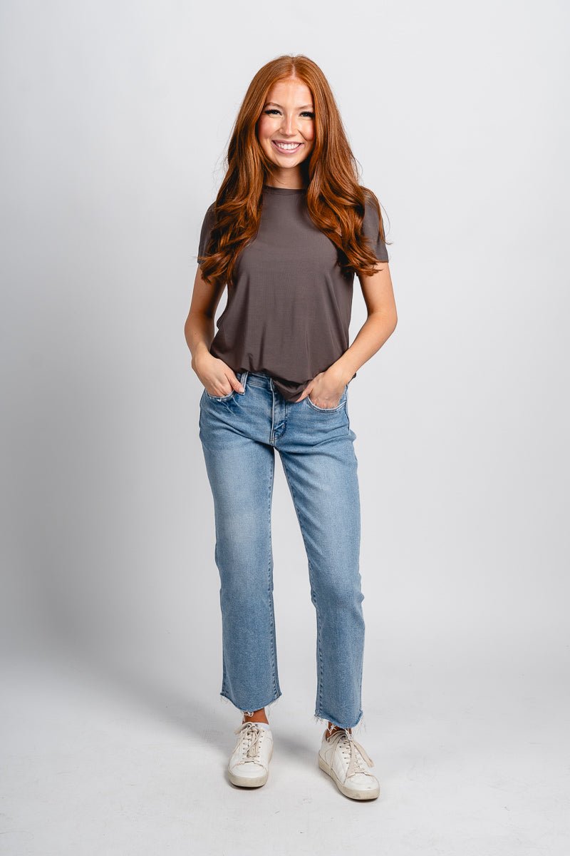 Charcoal short sleeve crew neck t-shirt featuring a super soft modal material from Lush Fashion Lounge women's boutique in Oklahoma City.